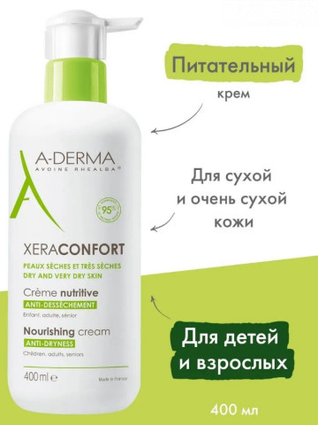 Питательный крем для лица и тела, для сухой и очень сухой кожи XERA CONFORT ANTI-DRYNESS, 400 мл. Питательный крем А-Дерма КСЕРАМЕГА КОМФОРТ предназначен для сухой и очень сухой кожи при ксерозе. Средство подходит для использования всей семьи и детей с самого раннего возраста. Восстанавливает комфорт, упругость и мягкость кожи. Экстракт ростков овса Реальба успокаивает и снимает раздражение на коже. Глицерин восстанавливает гидролипидную пленку, увлажняет и питает кожу. Витамин B3 способствует восстановлению кожного барьера. Омега-6 усиливает естественные защитные свойства кожи. Протестировано под контролем дерматологов и педиатров. Легкая жидкая текстура нежирного, нелипкого крема. Натуральная формула. Гипоаллергенная отдушка. Формула создана с целью минимизации риска аллергических реакций. Ежедневный смягчающий, увлажняющий и успокаивающий уход с защитным эффектом для очень сухой и атопичной кожи лица и тела.