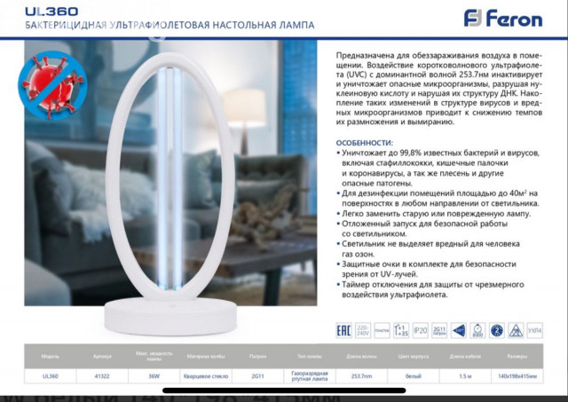 Бактерицидная лампа для дезинфекции помещений. Светильник не выделяет вредный для человека озон.
