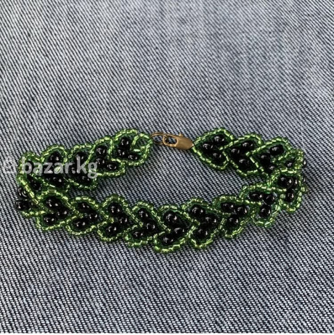 Браслет в форме сердечек из мелких черных бусин и зеленого прозрачного бисера.