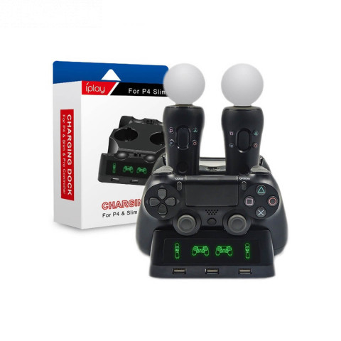 Особенности: Этот продукт может заряжать одновременно два джойстика PS4 и два джойстика PS Move. Имеется индикатор заряда. Простота в использовании Двухцветный светодиодный дисплей, чтобы показать состояние заряда продукта. Полная зарядка в течение 2-4 часов. Комплектация: Зарядное устройство Кабель USB