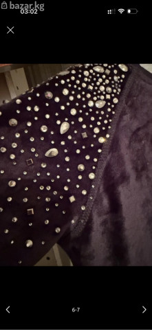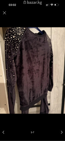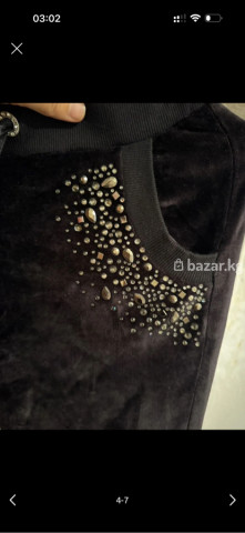 Женские велюровые джоггеры(двойка) с декором страз. - Цвет: глубокий черный - Материал: мягкий велюр с деликатным блеском - Посадка: на притачном поясе-резинке с кулиской; шнурок атласный с металлическими наконечниками - Карманы: 2 боковых - Декор: россыпь страз и фигурных камней у входов в карманы - Низ брюк: трикотажные манжеты - Крой: прямой, комфортный Подходят для повседневных образов и уютных выходов: сочетаются с худи, свитшотами, базовыми футболками и кедами/кроссовками. Мягкий велюр приятен к коже, манжеты и эластичный пояс обеспечивают удобную посадку, а стразы добавляют нарядный акцент.