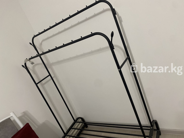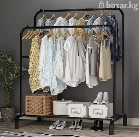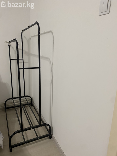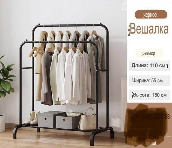- Цвет: черный, б/у почти новая - Конструкция: два параллельных перекладины для плечиков + нижняя полка по всей длине для обуви, коробок и корзин - Материал: металлическая рама с закругленными углами, усиленные стойки и поперечины - Устойчивые опоры с крепежом по углам - Компактная глубина для узких коридоров и гардеробных - Подходит для рубашек, платьев, пальто; нижняя полка выдерживает несколько пар обуви/контейнеров Размеры (указаны на фото): - Длина: 110 см - Ширина: 55 см - Высота: 150 см
