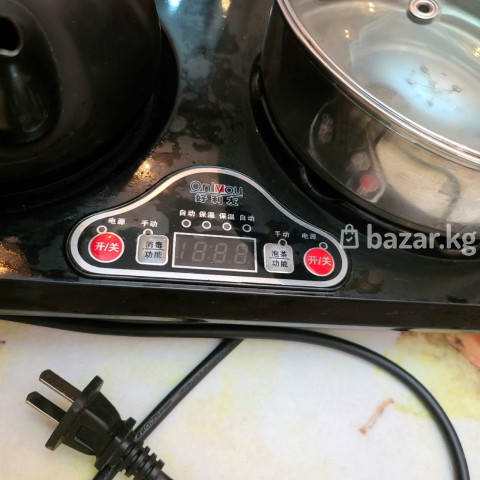 Электрический чайный набор OnlyYou с панелью управления Состав: - Электроплита с двумя зонами нагрева на одном основании: левая — для кастрюли, правая — для чайника/кипятильника. - Металлическая кастрюля с крышкой из стекла. - Чайник (черный) с носиком и крышкой. - Шнур питания с вилкой. Особенности и управление: - Центральная электронная панель OnlyYou с LED‑дисплеем и кнопками. - Отдельные кнопки «Вкл/Выкл» для каждой зоны. - Режимы: автоматический нагрев, поддержание температуры, функции кипячения/«пура чая» (по надписям на панели), ручная настройка. - Индикация работы и ступени нагрева светодиодами. Назначение: - Быстрое кипячение воды в чайнике. - подогрев в кастрюле чашек для чая - Подходит для чайных церемоний и повседневного использования на столе или на кухне