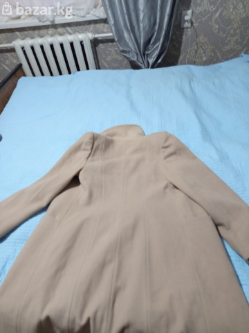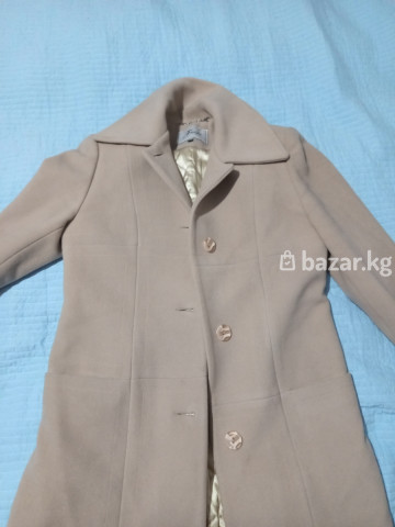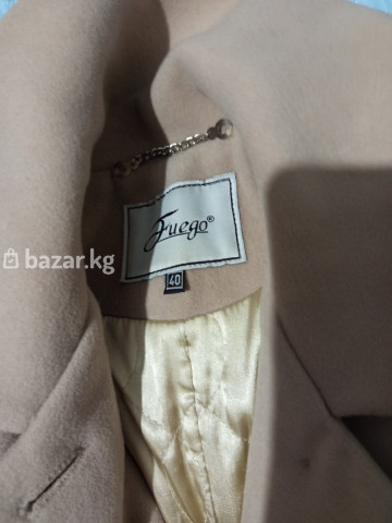 Женское пальто Fuego Франция, размер на ярлыке 40. - Цвет: бежевый (теплый нейтральный оттенок). - Крой: полуприталенный, длина ниже колена, классический отложной воротник, длинные рукава. - Застежка: на пуговицы спереди (видимая планка с несколькими крупными пуговицами). - Подкладка: стеганая, светло-шампанского цвета — обеспечивает дополнительное утепление и комфорт. - Детали: вертикальные рельефные швы визуально вытягивают силуэт; боковые карманы; петли под пуговицы аккуратно выполнены; внутренний декоративный цепочный подвес для вешалки. - Ткань верха: плотная, мягкая на ощупь, держит форму (судя по виду — шерстяной или шерстяной микс; точный состав на ярлыке не указан на фото). - Стиль: универсальная классика для осени и тёплой зимы, подходит к деловым и повседневным образам