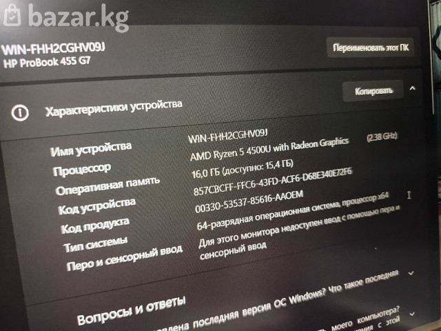 💻HP ProBook 455 G7 — привозной из США. Производительный бизнес-ноутбук для учёбы, офиса, программирования, дизайна, архитектуры, фотообработки и повседневных задач. В новом состоянии, без следов эксплуатации.В пользовании был минимально. ⚙️Характеристики: - Процессор: AMD Ryzen 5 4500U, 6 ядер/6 потоков, 2.4 ГГц (Boost до 4.0 ГГц) - Графика: AMD Radeon RX Vega 8 - ОЗУ: 16 ГБ - Накопители: SSD 256 ГБ + 512 ГБ (итого 750 ГБ) - Экран: 15.6" IPS Full HD (1920×1080) - Клавиатура с подсветкой, цифровой блок - Металлический и лёгкий корпус - Аккумулятор: 4–5 часов и выше в режиме интернет‑сёрфинга - Веб-камера, встроенный микрофон и динамики - Сканер отпечатка пальца ⚙️Порты и коммуникации: - Wi‑Fi, Bluetooth - 2×USB-A, HDMI, LAN (RJ‑45), USB Type‑C, кардридер SD, разъём для наушников 🧑‍💻Программное обеспечение: - Установлена Windows 11 + необходимые программы для офиса и работы 🎁В комплекте на фото: зарядное устройство, сумка и проводная мышь (подарок). Дополнительно указано: бесплатная доставка по городу и по всему Кыргызстану, гарантия 3 месяца, обмена и рассрочки нет.