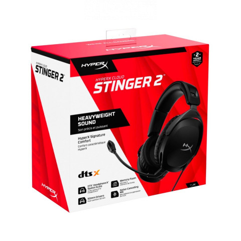 Общие параметры Тип  проводные наушники Модель HyperX Cloud Stinger 2 Игровые наушники  да Детский дизайн нет Способ передачи сигнала  проводной Тип конструкции  охватывающие Формат звуковой схемы  2.0 Внешний вид и конструкция Основной цвет наушников черный Материал амбушюр мягкая пена, кожзам Метод крепления  без крепления Акустические характеристики Диаметр мембраны излучателей  50 мм Минимальная воспроизводимая частота  10 Гц Максимальная воспроизводимая частота  28000 Гц Количество излучателей с каждой стороны  1 Характеристики микрофона Микрофон  есть Направленность двунаправленный Чувствительность микрофона  -40.5 дБ Расположение микрофона на наушниках Съемный микрофон нет Крепление микрофона подвижное Функции и особенности микрофона  шумоподавление микрофона Проводное подключение Тип проводного соединения jack 3.5 мм Переходник в комплекте 2х jack 3.5 мм — jack 3.5 мм Функции и управление Регулятор громкости есть Дополнительная информация Поддержка беспроводной зарядки  нет Наушники для спорта  нет Комплектация документация, аудиокабель соединительный 1 шт Вес 272 г