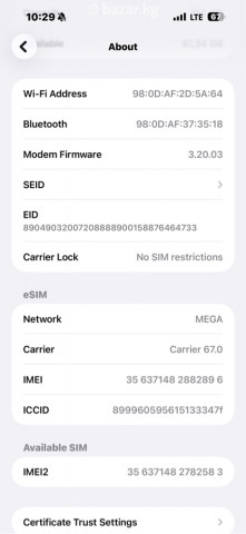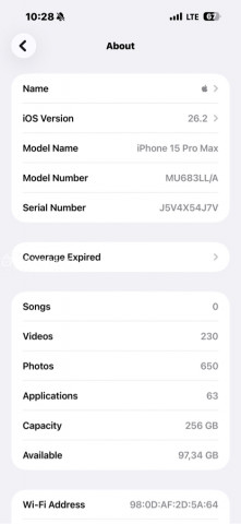 IPhone 15 Pro Max в идеальном состоянии модель MU683LL/A. Память 256 ГБ. Установлена iOS 26.2. Серийный номер: J5V4X54J7V. Статус «Coverage Expired». Раздел «О устройстве» показывает: 0 песен, 230 видео, 650 фото, 63 приложения. Смартфон с поддержкой LTE.