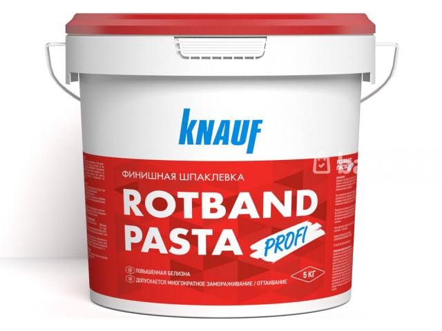 KNAUF Rotband pasta Готовая к применению пастообразная финишная шпатлевка на виниловой основе. Применяется внутри помещений для финишного шпаклевания поверхности гипсокартонных или гипсоволокнистых листов, оштукатуренных и бетонных поверхностей, пазогребеневых плит, стеклохолста при подготовке под высококачественную окраску, оклейку обоями, перед нанесением венецианской штукатурки и других финишных материалов.