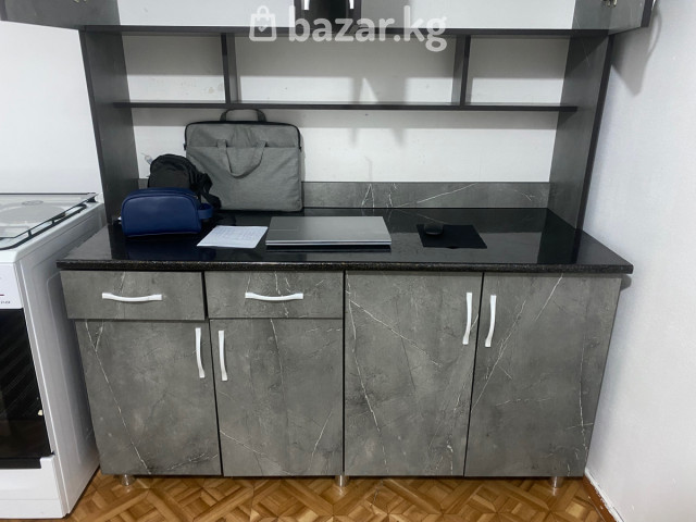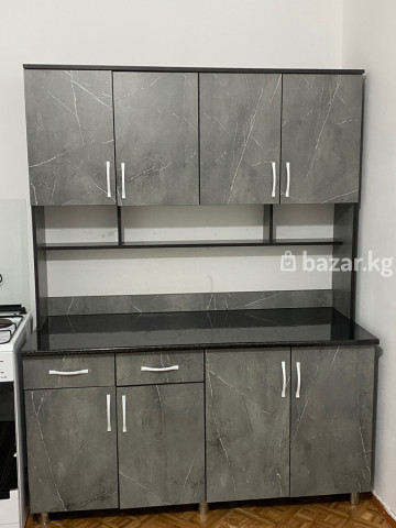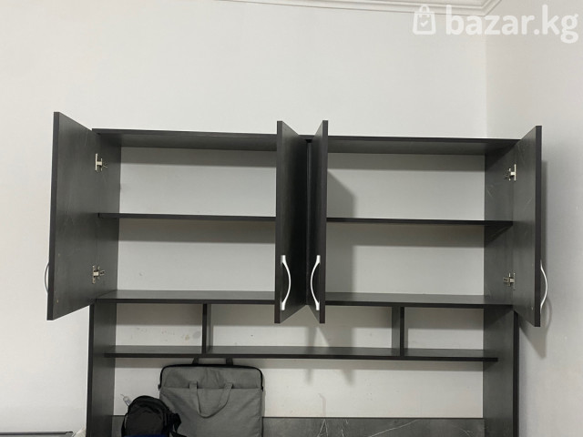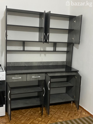Кухонный гарнитур с верхними и нижними шкафами, рабочей столешницей и открытой полкой. Характеристики: - Компоновка: нижний модуль с широкой рабочей поверхностью и цоколем на ножках; верхний модуль с тремя распашными шкафами и открытой полкой по всей длине. - Места хранения: 5 распашных шкафов внизу (в том числе отделение под раковину/крупную посуду), 2 выдвижных ящика; 4 распашных шкафа сверху с полками. Вместительные полки внутри всех секций. Столешница: темная, глянцевая, выдерживает ежедневные кухонные нагрузки, легка в уходе. - Фурнитура: ручки белого цвета, петли на доводчиках (на фото — мягкое закрывание), качественная сборка. Г.Бишкек 5 мкр