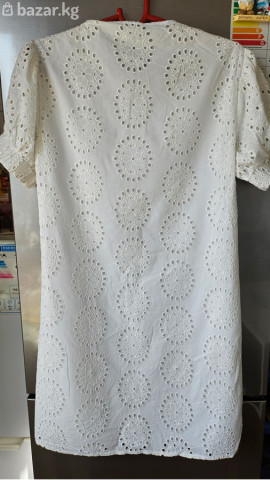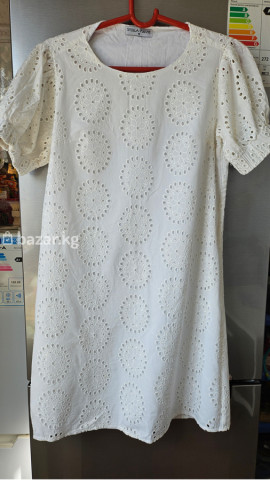 Белое хлопковое платье с ажурной вышивкой из 100% хлопка. Бренд Stella Pukvis. Фасон: прямое платье до колена. Подкладка есть, не просвечивает. Рукава короткие объемные с мягкими сборками и ажурными вставками. Турция. Идеальна для лета, смотрится воздушно и женственно