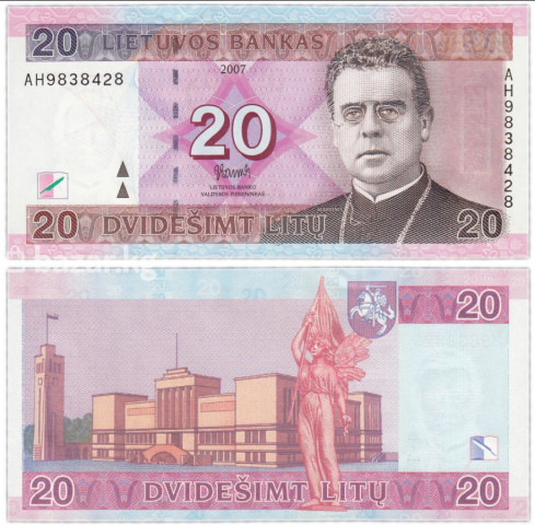 Коллекционная банкнота Литвы — 20 литов. В наличии: ✅ - Номинал: 20 litų (DVIDEŠIMT LITŲ). - Эмитент: Lietuvos Bankas (Банк Литвы). - Год выпуска, указанный на банкноте: 2007. - Серия и номер: (на лицевой стороне справа и слева). - Основной цвет: розово-фиолетовый с голубыми элементами. - Лицевая сторона: портрет поэта Майрониса; крупная цифра «20» в розовой звезде; надписи LIETUVOS BANKAS и DVIDEŠIMT LITŲ; подпись председателя правления; водяной знак и защитные элементы, включая микропечать, защитную нить и регистр. - Оборотная сторона: здание Музея дьявола/культурного комплекса в Каунасе (межвоенная архитектура) и скульптура с флагом; герб с всадником Vytis; номинал «20» в углах. - Язык надписей: литовский. - Формат: классическая бумажная банкнота с многоцветной печатью и элементами защиты. - Назначение: интересна коллекционерам бонистики, иллюстрирует период литовской валюты до введения евро. - На полях видны элементы совмещающегося рисунка и цветного регистрирующего знака. - Чёткие детали гравюры и орнаментальные фоны, характерные для серии литовских литов. F(Fine): Долгое хождение, сильные изгибы, края изношены, но без дыр. ❗На фото представлен пример. Серия и номер могут отличаться. ❗ Данная банкнота подлинная. 💰 Оплата принимается: С $ € £ 📌 Купить банкноту можно за евро-монеты. ❕ Объявление будет удалено или деактивировано после продажи. Только личная встреча ♦️♦️♦️