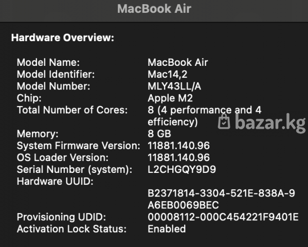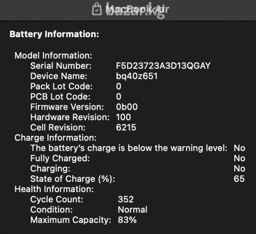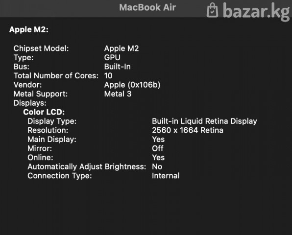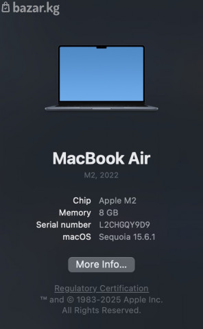 Продаю MacBook Air 13,6” M2 (Midnight), 2022 M2: 8 CPU / 10 GPU Память: 8 / 512 GB Батарея: 83% износа, 352 цикла — держит заряд стабильно, без сюрпризов Состояние — идеальное, ни одно царапины. С первого дня в чехле и защитном стекле, использовался бережно. Полный комплект: коробка, зарядка — всё на месте. Цена: 65 000 P.S. Если мак понравился, но цена кусается — напиши в лс. В хорошие руки сделаю скидку 😉 P.S. Все характеристики как тут: https://softech.kg/noutbuk-apple-macbook-air-13-6-2022-apple-m2-8512gb-ssd/ TG: @sanzharidze