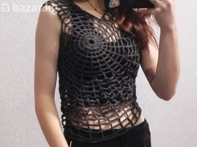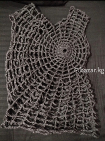 Вязаный крючком ажурный топ-сетка - Цвет: графитовый/темно‑серый - Материал: мягкая пряжа (на фото — фактурная, держит форму) - Техника: круговой мотив от центра с расширением, образует выразительный «паутинный» рисунок - Крой: без рукавов, округлая пройма, V‑образный вырез спереди и сзади, приталенный силуэт с легким расширением к низу - Эластичность: полотно тянется и подстраивается по фигуре - Как носить: поверх базового топа, бра или платья; подходит для летних образов, пляжа и фестивалей Размеры по ленте на фото: - Длина по центру: около 47–48 см - Ширина по груди в спокойном состоянии: около 33–34 см (растягивается больше за счет сеточного узора) Особенности: - Легкий, воздушный, хорошо вентилируется - Быстро сохнет - Рельефная вязка, аккуратно обработанные края