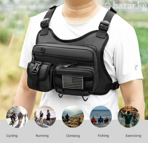 Нагрудная сумка‑жилет тактического типа - Назначение: бег, велосипед, треккинг/скалолазание, рыбалка, тренировки, активный отдых. - Посадка: регулируемые плечевые лямки и боковые стяжки; эргономичная форма жилета, плотная фиксация и распределение веса. - Отделения: - большой верхний карман на молнии, - фронтальный карман среднего размера на молнии с велкро‑панелью для нашивок, - компактный боковой карман с клапаном на фастексе, - задний карман на молнии. - Организация: внешние D‑образные кольца для подвеса, петли MOLLE/велкро для крепления аксессуаров, кабельный вывод под наушники/пауэрбанк. - Материалы: износостойкая ткань с водоотталкивающим покрытием спереди; дышащая перфорированная сетка со стороны спины для вентиляции. - Безопасность: светоотражающая вертикальная полоса на спинке. - Закрытие: надежные молнии и фастексы, широкие липучки. - Цвет: черный. - Универсальный размер: регулировка по росту и объему. Практичный формат для переноски телефона, ключей, документов, кошелька, мультитула и мелких аксессуаров, освобождает руки и не мешает движению. Вотсап или звонок 0224545488 #спорь#барсетка#нагрудная#тактическая#велопрогулка#отдых#туризм#такси#сумка#рюкзак#