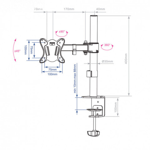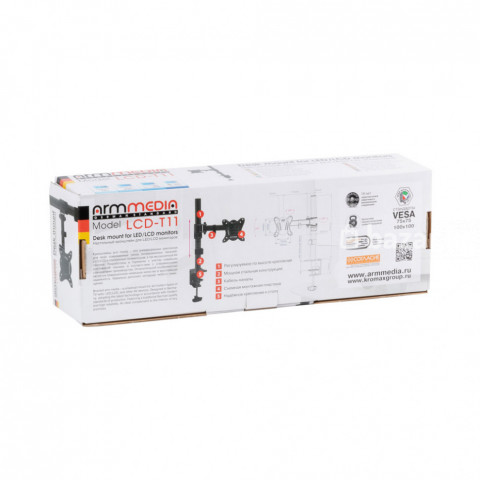 Кронштейн для ТВ мониторов ARM MEDIA LCD-T11 – это универсальный настольный крепеж для большинства моделей от 15 до 32 дюймов (от 38 до 81 см). Кронштейн ARM MEDIA LCD-T11 позволяет устанавливать экран в удобное положение, он свободно двигается в разных направлениях, его можно наклонять на ±45°, поворачивать на 360° вокруг штанги, изменять вылет и регулировать высоту установки экрана над столом. Высота штанги 400мм. Кронштейн ARM MEDIA LCD-T11 рассчитан на максимальную нагрузку до 12 кг. Легкая установка и регулировка. Имеются специальные зажимы для проводов. Поддерживает стандарты VESA: 75x75, 100x100.