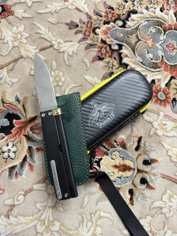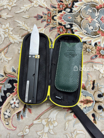 Нож складной Atomsknife в комплекте с кейсом и кожаным чехлом. Характеристики и комплект: - Складной нож с прямым клинком drop-point. Финиш клинка — stonewash. - Рукоять прямоугольного профиля, анодированный металл черного цвета. - Фирменная клипса с гравировкой ATOMSKNIFE. - Механизм открытия — фронтальный сдвиг/ползунок на боковой панели (out-the-front стиль), фиксатор на винтах. - Упорный узел с латунным элементом у основания клинка. - Защитный чехол из фактурной зеленой кожи с тиснением логотипа. - Жесткий кейс-пенал на молнии с желтым кантом, внутренние отделения: эластичная петля под нож, карман-сетка на молнии, отделение под чехол; стропа-ремешок для переноски. - В комплекте сменный/обслуживающий штифт (в сетчатом кармане). Подходит для повседневного ношения, туризма и коллекции: удобный клинок универсальной формы, прочная рукоять, надежная клипса, транспортировка в защищенном кейсе.