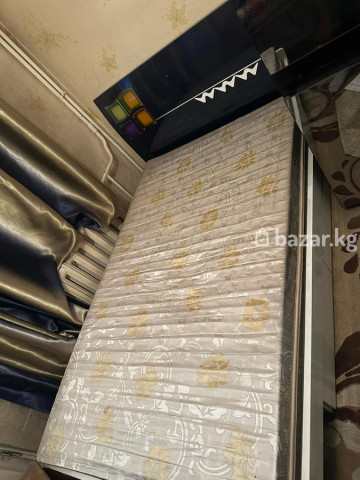 Односпальная кровать с матрасом. - Размер спального места: ориентировочно 90–100 × 190–200 см (по фото стандарт односпальный). - Основание: ламели. - Изголовье: глянцевое, черное, с декоративной вставкой и цветными элементами. - Корпус кровати: светлый (белый/слоновая кость), прямые борта. - Матрас: пружинный/слоистый, высота средняя; чехол стеганый с узором в светло‑серой гамме с золотистыми цветами. - Подходит для детской, гостевой или небольшой спальни. - Стиль: современный, лаконичный; легко сочетается с нейтральным текстилем и мебелью. Комплект обеспечивает ровное спальное место и поддержку благодаря ламелям и упругому матрасу. Идеален для ежедневного сна или размещения гостей.