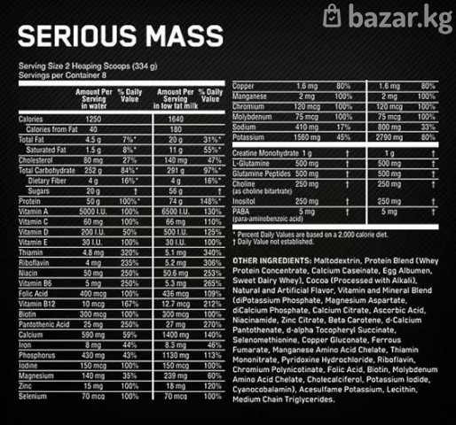 1 250 калорий в порции на воде; 1 630 калорий в порции на нежирном молоке 50 г протеина, комбинированного из быстрых и медленных компонентов, таких как сыворотка, казеин, яичный протеин Больше 250 г углеводов для поддержания энергии во время интенсивных тренировок и восполнения запасов гликогена. БЕЗ САХАРА. Усилен креатином, L-глютамином, пептидами глютамина, холином, инозитолом, PABA, MCT 25 витаминов и минералов с преобладанием витаминов группы B и антикоксидантов Состав Optimum Nutrition Serious Mass Размер порции: 2 мерные ложки (334 г) Порций в упаковке: 16 Количество питательных веществ в одной порции продукта Калории – 1250 ккал Калории из жиров – 30 ккал Всего жиров – 3,5 г Насыщенные жиры – 2 г Холестерин – 80 мг Всего углеводов – 254 г Сахар – 23 г Протеин – 50 г Витамин А – 5000 МЕ (100% РДН*) Витамин С – 60 мг (100% РДН) Витамин D – 200 МЕ (50% РДН) Витамин Е – 30 МЕ (100% РДН) Тиамин – 4,8 мг (320% РДН) Рибофлавин – 4 мг (235% РДН) Ниацин – 50 мг (250% РДН) Витамин В6 – 5 мг (250% РДН) Фолиевая кислота – 400 мкг (100% РДН) Витамин В12 – 10 мкг (167% РДН) Биотин – 300 мкг (100% РДН) Пантотеновая кислота – 25 мг (250% РДН) Кальций – 630 мг (63% РДН) Железо – 5 мг (28% РДН) Фосфор – 460 мг (46% РДН) Иод – 190 мкг (100% РДН) Магний – 140 мг (35% РДН) Цинк – 15 мг (100% РДН) Селен – 70 мкг (100% РДН) Медь – 1 мг (50% РДН) Марганец – 2 мг (100% РДН) Хром – 120 мкг (100% РДН) Молибден – 75 мкг (100% РДН) Натрий – 480 мг (20% РДН) Калий – 990 мг (28% РДН) Моногидрат креатина – 1 г L-глютамин – 500 мг Глютаминовые пептиды – 500 мг Холин (холин битартрат) – 250 мг Инозитол – 250 мг PABA (парааминобензойная кислота) – 5 мг Ингредиенты: Мальтодекстрин, протеиновая смесь (концентрат сывороточного протеина, казеинат кальция, яичный альбумин, сладкая молочная сыворотка), искусственные ароматизаторы, витаминная и минеральная смесь (фосфат дикалия, аспартат магния, фосфат дикальция, цитрат кальция, аскорбиновая кислота, ниацинамид, цитрат цинка, бета-каротин, пантотенат дикальция, d-альфа-токоферола сукцинат, селенометионин, глюконат меди, фумарат железа, аминокислотный хелат марганца, мононитрат тиамина, пиридоксина гидрохлорид, рибофлавин, полиникотинат хрома, фолиевая кислота, биотин, аминокислотный хелат молибдена, холекальциферол, иодид калия, цианокобаламин), триглицериды со средней цепью (MCT), лецитин, пищевые красители, ацесульфам калия. Содержит молочные, яичные, пшеничные и соевые ингредиенты. Способ применения: Добавьте две мерные ложки Serious Mass в блендер вместе с водой или молоком и взбейте. Если вы принимаете Serious Mass впервые, начните с половины порции в день. Через неделю увеличьте потребление до 1 и более порций. ВкусШоколад