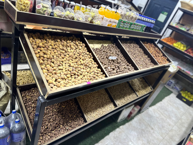Оборудование для продуктового магазина/овощной лавки – комплект стеллажей и витрин Состав: - Напольные металлические стеллажи с наклонными полками под фрукты, овощи, орехи и бакалею - Центральный остров с лотками для навальных товаров (орехи, сухофрукты, конфеты) - Многоярусные полки для фасованных сладостей, печенья, шоколада и снеков - Секции с бортами/лотками для рассыпных продуктов - Корзины для выкладки (плетёные) - Прочные каркасы из металла, полки из ЛДСП/OSB с ограничителями - Встроенное верхнее освещение торговой зоны (светильники на потолке) Особенности: - Удобная высота и наклон полок для быстрой выкладки и хорошей видимости товара - Разделители для аккуратного зонирования ассортимента - Подходит для свежих фруктов и овощей, орехов, сухофруктов, сладостей, напитков в ПЭТ, фасованных продуктов - Универсальная конфигурация: пристенные стеллажи + центральный остров - Лёгкая уборка и обслуживание; устойчивые конструкции - Эстетичный вид торгового зала: единый стиль, аккуратная презентация товара Идеально для: - Овощных и фруктовых лавок - Магазинов орехов и сухофруктов - Небольших продуктовых магазинов, фермерских лавок, кондитерских корнеров Габариты и количество секций видны на фото.
