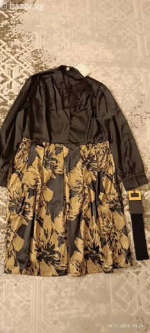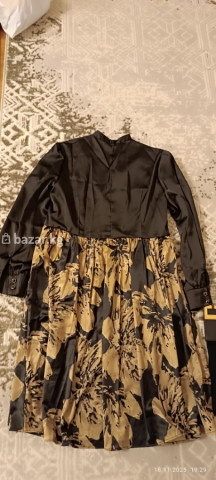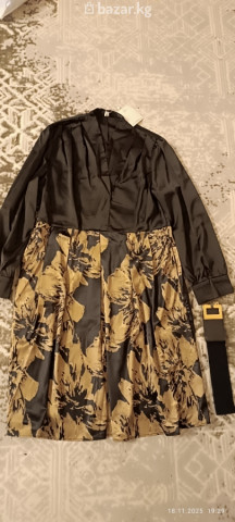 Платье миди с длинным рукавом и съемным ремнем - Верх: однотонный черный атласный лиф с V‑образным запахом/имитацией запаха, отрезная талия. - Рукава: длинные, манжеты на пуговицах. - Низ: расклешенная юбка миди из атласной ткани с крупным цветочным принтом в бежево‑черной гамме, мягкие встречные складки по талии. - Детали: широкий эластичный ремень черного цвета с крупной прямоугольной пряжкой под матовое золото (на фото справа). - Застежка: потайная молния/шов по спинке (видна конструкция). - Посадка: подчеркнутая талия, свободная юбка. - Повод: торжество, вечерний выход, офисные мероприятия и др. - Материалы по ощущениям: гладкая атласная/сатиновая ткань с легким блеском. Цвета: черный верх, черно‑бежевый принт на юбке. Комплект: платье + ремень