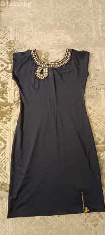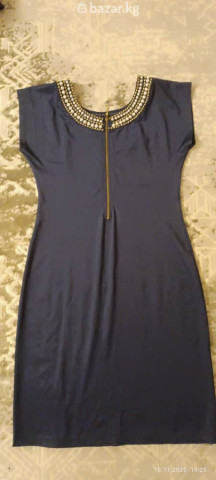 Платье-футляр темно-синего цвета с короткими рукавами. - Силуэт: приталенный, длина примерно до колена. - Горловина: круглый вырез, богато украшен крупными белыми бусинами в два ряда и декоративным узором спереди. - Застежка: длинная фигурная молния золотистого цвета по спинке; внизу спереди — короткая декоративная молния с подвеской. - Ткань: эластичная, гладкая, держит форму. - Стиль: коктейльный/вечерний, акцент на воротнике, минималистичный крой. Идеально для торжеств, выходов, мероприятий: украшенный ворот делает образ самодостаточным, можно сочетать с нейтральными аксессуарами. Цвет — глубокий navy.