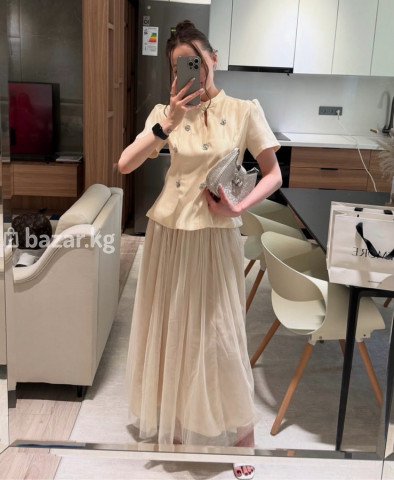 Женский комплект в молочном оттенке - Верх: приталенная блуза с коротким рукавом и стоячим воротником. Декор двойным рядом пуговиц-цветков, формирующие вытачки визуально подчёркивают талию, аккуратный расклёшенный низ. - Низ: длинная струящаяся юбка А-силуэта из полупрозрачного легкого слоя поверх плотной подкладки; мягкие складки создают воздушный объем и плавное движение. - Цвет: айвори/крем. - Посадка: женственная, элегантная, подходит для торжеств и повседневных выходов. - Сочетания: гармонирует с минималистичными лодочками или сандалиями, клатчем или маленькой сумкой; хорошо смотрится с лаконичными украшениями. Идея образа — нежная классика с азиатскими нотками за счёт стоечного воротника и симметричной застёжки.