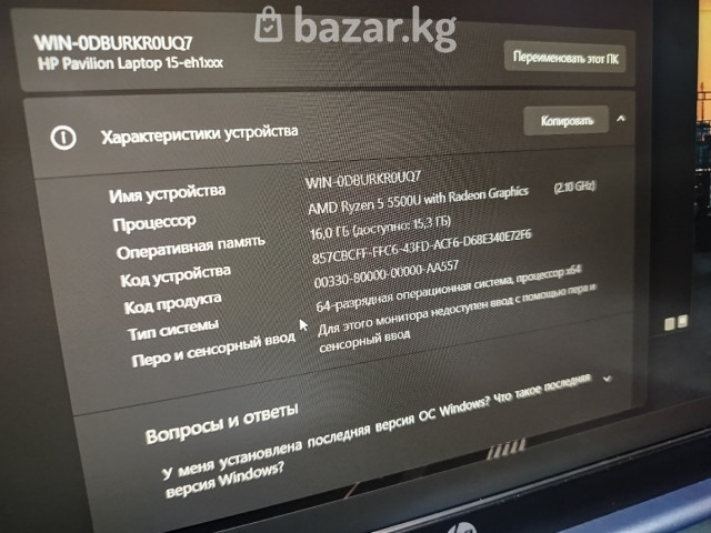 Мощный Почти Новый Ноутбук бизнес-класса. С большим запасом на долгие годы. Подходит для тяжелых универсальных задач. Проработал всего неделю, в новом состоянии. 💻Фирма Hp Pavilion 15 Строгий, крепкий корпус, полностью металлический, очень легкий и удобный. Работает очень быстро! 🎁При покупке в подарок: Мышка, сумка, коврик для ноутбука. 📍3 месяца гарантии ❌Обмена и рассрочки нет 🚗Бесплатная доставка по всему Кыргызстану ♦️Процессор Ryzen 5-5500u 2.1 ghz с режимом Turboboost до 4.0 Ghz /6 ядер+12 потоков ♦️Оперативная память 16 Gb ♦️Общая память SSD 512 скоростной М2 ♦️Видеокарта Amd Radeon vega 8 - 4Gb ♦️Размер экрана 15.6 Дюймов Full hd ips (1920x1080) тонкие рамки, Отличное качество ♦️Установлен свежий Windows 11+программы для офиса и работы. 💻Ноутбук подойдет для програмирования всех направлений| учебы| учителей| студентов| 3D работ| автокад| архикад| айтишников| работы| разных игр| фотошоп| фото-видео обработка| таргет| бухгалтерия 1с| валдбериес| дизайн| маркетплейсы| азон| графис| и подобное. ♦️Есть все необходимые подключения, камера, встроенный микрофон. Wi-fi, bluetooth, usb 2:0-3.1, hdmi. Встроенные динамики, Lan