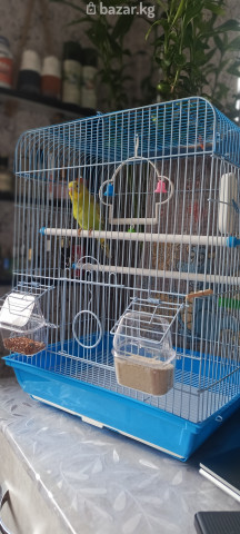 Клетка с волнистым попугаем(учится говорить) 4 недели примерно ему Описание: - Клетка синего цвета. - Размер: компактная прямоугольная форма с купольной крышей (подходит для установки на стол/тумбу). - 2 прозрачные внешние кормушки-бункеры с крышками (удобно наполнять снаружи). - Игрушка-качели с разноцветными колокольчиками для активности птицы. - Боковое крепление для минерального камня/сепии. аксессуары входят в комплект как на фото, плюс корм в подарок