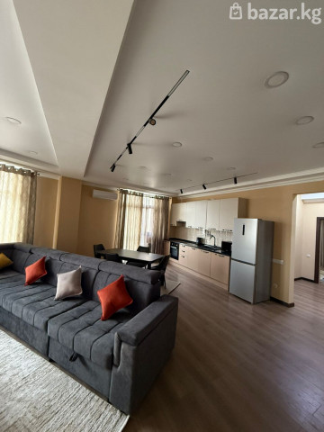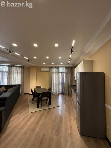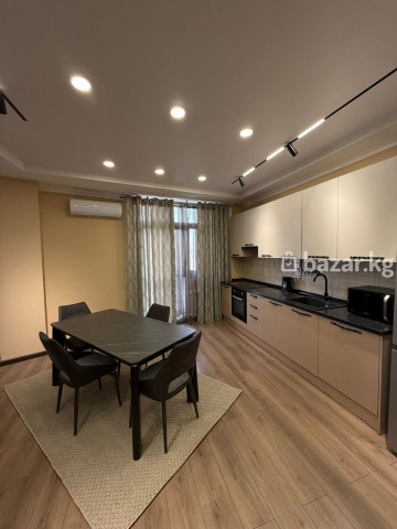Дом -Бонжур (золотой квадрат) напротив Карвена (Дордой-Плаза) 2016 год постройки 95 км2 Цена:167.000$ полностью мебелирована 10 этаж из 11 документы: ДКП , тех. Паспорт. Красная книга Планировка и интерьер: - Большая гостиная с панорамными окнами, зонирована на лаунж и столовую. Установлен настенный телевизор, медиа-тумба, угловой диван. - Обеденная зона: стол,стулья, рядом выход на балкон/лоджию. - Кухня в едином пространстве с гостиной: длинная линейная кухонная мебель, встроенная варочная панель, духовой шкаф, вытяжка, посудомоечная машина, микроволновая печь, холодильник. Сплит-система. - Спальня с двуспальной кроватью, прикроватными тумбами, рабочим местом у окна и ярким акцентным ковром. Плотные шторы блэкаут и дневные занавеси. - В прихожей — большой модульный шкафный ряд. ID: 70907