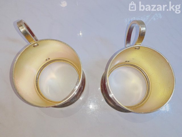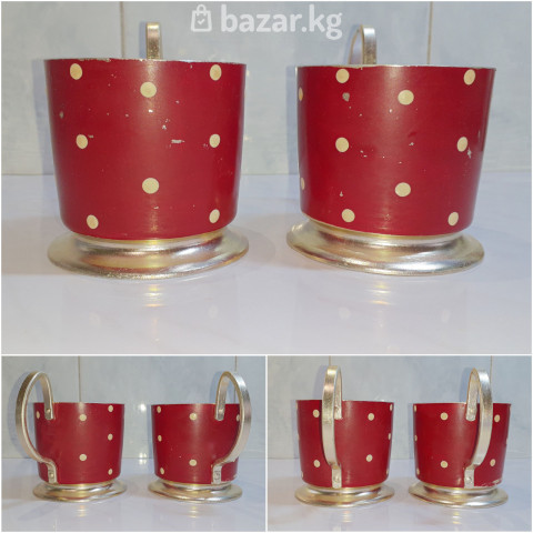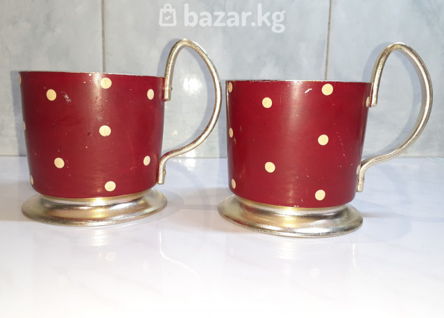 Продам именно Серебрянные подстаканники с золочением СССР (1950-х гг.) с эмалированным покрытием гранатового оттенка в молочный горошек. Прежде, чем писать объявление предметы продажи были тщательно изучены с получением надлежащей консультации разбирающихся в столь тонких предметах. Вес 1 подстаканника: 67 гр Вес 2-х подстаканников: 134 гр Высота без ручки: 7 см Высота с ручкой: 9 см Диаметр: 7,2 см Толщина стенки: 1 мм Продам Золочённые Серебрянные подстаканники с эмалированным покрытием насыщенного гранатового цвета в молочный горошек и элегантной аккуратной ручкой производства времён СССР (1950-х гг.), редкий выпуск. Паре подстаканников уже свыше 65 лет, конечно же на них следы бытования. На фото реальное состояние. Только серебро при касании издаёт звонкий звук с небольшим эхом, что и подтверждает качество (к примеру, аллюминивые издают напрочь глухой звук). Изделия: Подстаканники Материал: серебро Первое покрытие: золочение Второе покрытие: эмаль Цвет: позолоченные с эмалированием гранатового оттенка в молочный горошек Производство: СССР (1950-х гг.) Состояние: б/у, поэтому имеются небольшие царапины и потёртости, но сохранились очень даже неплохо. Серебро не потемневшее за годы. P.S.: В других странах в гораздо худшем состояни во много раз дороже, но разумный торг возможен. Цена: 11000 сом за пару.
