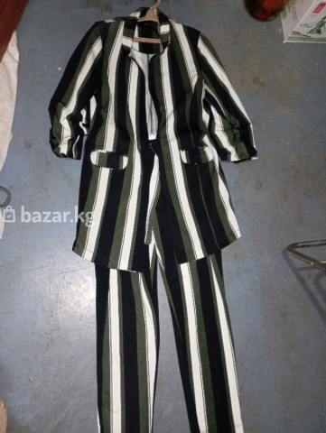 Твой идеальный total look для ярких будней! ✨ Хочешь приковывать взгляды? Этот костюм-двойка в стильную контрастную полоску (зеленый, черный, белый) — именно то, что нужно. Силуэт: Удлиненный жакет с рукавом 3/4 и прямые брюки создают безупречный образ. Эффект: Вертикальная полоска визуально делает вас выше и стройнее. С чем носить: С базовым топом или кедами для прогулок, либо с лодочками на деловую встречу. Разделяй и властвуй: жакет отлично смотрится с джинсами, а брюки — с однотонным худи или блузой. 📍 Размер: [48-50] 📍 Состояние: [/новое]. Турция 📍 Цена: [800]