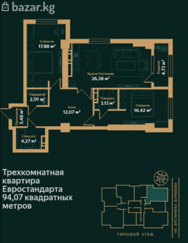 . Продаю 3к -комнатнуя квартиру с подземным паркингом и кладовой от стоительной компании Нурзаман . Жилой комплекс Regency"(Ридженси.) . Адрес: Аалы Токомбаева улица , 23/8а . Характеристики: -- Площадь 94,07 м2 . -- На 13 этаже из 15 . — Индивидуальное газовое отопление . — Потолки 3,45 м — ощущение простора и свободы для дизайнерских решений — Одноподъездный дом с ресепшеном и двухуровневым паркингом . — Максимум безопасности: видеонаблюдение по периметру и внутри , домофон с распознаванием лиц . — В холле ресепшн , на 1-ом этаже имеется санузел а также помещение для колясок . — Комфортное обслуживание от собственной управляющей компании . — Развитая инфраструктура: всё необходимое рядом . Идеальный выбор для тех , кто ценит комфорт , безопасность и статус . Завершение строительства — октябрь 2026 года . В стоимость входит келлер 5 м2 (кладовая) и место в подземном паркинге . ЦЕНА 14.875.000 сомов или 170.000 & . ТОЛЬКО НАЛИЧНЫЙ РАСЧЁТ . ВАРИАНТОВ ОБМЕНА , РАССРОЧКИ НЕТ . Телефон 0550 31 31 31 ( пишите мне на вотсап )