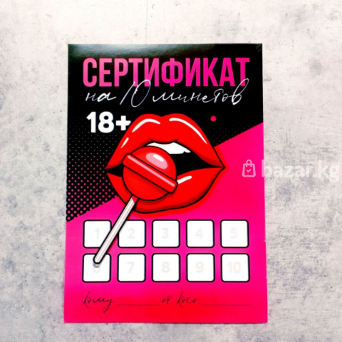 Сертификат на 10 минетов (с губами) Яркий абонемент в стиле поп-арт, который превращает удовольствие в увлекательную игру с подсчетом очков. Каждое из десяти пустых окошек ждет своей отметки после жаркого свидания. Этот дерзкий сувенир станет отличным поводом чаще радовать друг друга без особого повода.