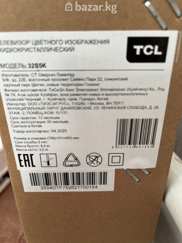TCL QLED Smart TV 32S5K — 32" Основные особенности: - Экран 32" QLED: яркие цвета, высокий контраст. - Поддержка HD/HD10. - Смарт‑платформа TCL Smart TV. - Звук Dolby Audio. - Разрешение: ЖК‑панель (QLED подсветка). - Металлический безрамочный дизайн (указано на коробке: Metallic Bezel‑Less). - Интерфейсы: HDMI (логотип на коробке), аналоговый AV (в комплекте переходник «тюльпаны»), возможно USB и антенный вход (типично для модели; в комплекте пульт ДУ). - Размер упаковки: ?485 мм. - Масса брутто: 4,4 кг; масса нетто: 3,2 кг. - Срок службы: 5 лет. Срок эксплуатации: 60 месяцев. - Страна изготовления: Китай. - Модель: 32S5K. Комплектация по фото: - Телевизор TCL 32S5K. - Пульт дистанционного управления. - Силовой кабель. - Переходник AV (RCA). - Документация/руководство. Дополнительно: - Изготовлен: 04.2025. - Маркировка ЕАС.