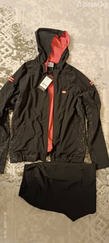 Спортивный костюм (куртка с капюшоном + брюки) - Цвет: черный с контрастной розовой подкладкой капюшона и вставками. - Верх: легкая куртка на молнии, капюшон со шнурком, два боковых кармана на молниях, эластичные манжеты и низ. Логотип спереди, рефлективные/декоративные вставки по рукавам. - Низ: прямые брюки с эластичным поясом. - Материал: гладкая ткань быстросохнущего типа (предназначена для спорта и активного отдыха). - Назначение: бег, тренировки на улице и в зале, повседневная активность в межсезонье. - Особенности: легкий, дышащий, защищает от ветра; молнии на карманах фиксируют мелочи. На куртке сохранены бирки производителя.