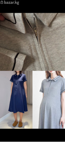 Платье для беременных с молнией и воротником-поло - Свободный А-силуэт до колена: комфортно на любом сроке, не стесняет движения. - Удобная центральная молния спереди — легко надевать и снимать; подходит для послеродового периода и кормления. - Классический воротник-поло и короткие рукава с контрастным кантом. - Мягкий трикотаж средней плотности, приятный к коже, хорошо драпируется. - Цвета: темно-синий и светло‑серый с контрастной отделкой. - Акуратные швы, аккуратная отстрочка по рукавам и воротнику. - Универсальный стиль: повседневная носка, прогулки, поездки, домашний комфорт.