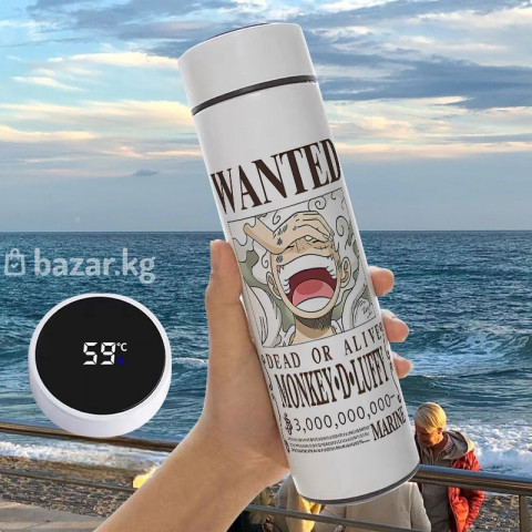 Термос-бутылка с экраном температуры и рисунком из аниме One Piece (Monkey D. Luffy) - Встроенный LED-дисплей на крышке показывает текущую температуру напитка. - Герметичная крышка с сенсорным индикатором. - Дизайн: «WANTED» постер Манки Д. Луффи, контрастная белая поверхность с цветной печатью. - Подходит для чая, кофе, воды; удобно брать в дорогу, офис, на учебу и тренировки. - Удерживает тепло/холод в течение длительного времени; узкий формат помещается в подстаканники и рюкзак. - Легко очищается, широкое горлышко для комфортного наполнения кубиками льда или пакетиками чая.