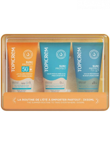 Топикрем Дорожный набор Sun Protect: молочко SPF50+ 50 мл + желе после загара 50 мл + гель для душа 50 мл (Topicrem, ) В набор входят три мини продукта: В набор входят два продукта для всей семьи, включая детей от 3х лет: 1. Увлажняющее солнцезащитное молочко для тела SPF50+ 50 мл Обладает высокой степенью защиты от УФ-излучения. Имеет приятный тонкий аромат и текстуру, которая обеспечивает надёжную защиту от солнца, не оставляя следов на коже. Формула средства содержит УФ-фильтры и обогащена активным компонентом для защиты клеток кожи от фотостарения. Водостойкое средство. Не стирается при контакте с песком. Для чувствительной кожи и всей семьи. 2. Освежающее желе после загара 50 мл Мгновенно успокаивает и освежает кожу, возвращая ей комфортное состояние после загара. Гель мгновенно впитывается, не оставляя ощущения липкости или жирности на коже. Для всей семьи. Средства протестированы на чувствительной коже до и после пребывания на солнце, воздействия морской воды и хлорированной воды из бассейна. Успешно прошли дерматологический и педиатрический контроль. 3. Увлажняющий гель для душа, 50 мл Увлажняющий гель для душа обеспечивает бережное очищение кожи лица и тела. Гель эффективно удаляет морскую соль, песок, хлор и остатки солнцезащитных средств. Аромат геля сочетает в себе ноты персика, цветка франжипани и ванили, создавая притягательный и запоминающийся аромат. Этот продукт станет идеальным выбором для тех, кто ценит качество, эффективность и приятные ощущения от использования косметических средств.