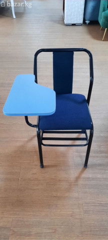 Учебный стул с откидной партой - Компактный стул с интегрированной рабочей поверхностью слева. Столешница из ЛДСП/МДФ голубого цвета с фигурным вырезом для удобной опоры руки и размещения тетради или ноутбука. - Прочная металлическая рама черного цвета, устойчивая к ежедневной эксплуатации. - Мягкое сиденье и спинка, обиты плотной темно‑синей тканью.