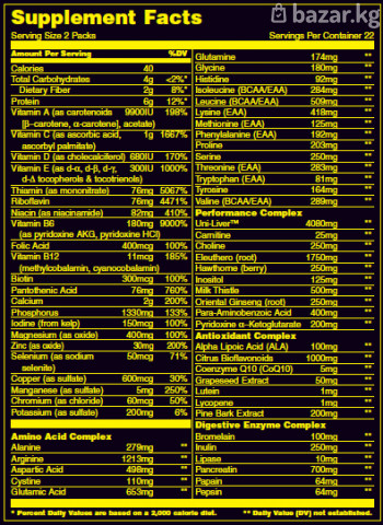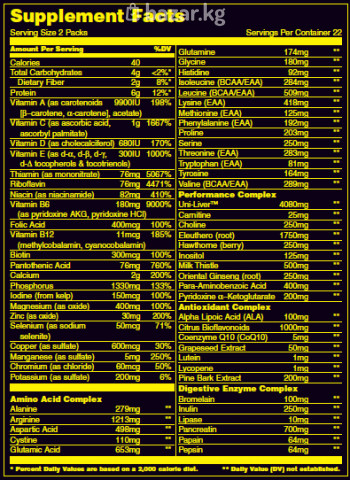 Universal Nutrition Animal Pak 44 пакетиков в каждом пакетике 11 таблеток. Animal Pak был запущен в 1983 году фирмой Universal Nutrition.С 1983 года по нынешнее время считается одним из лучших комплексов который используют для подготовки спортсменов всего мира. Animal Pak от Universal Nutrition специально разработан для спортсменов и бодибилдеров и тяжелоатлетов мирового класса. Чтобы жать железо, Вам необходимо иметь хорошее питание и добавки! Animal Pak не исключение. Вы можете использовать его для набора мышечной массы, а так же в периуд диеты поддерживать себя так как в Animal Pak входит: коровье молозилово, L-аргинин, женьшень, около 55 веществ. Информация: добавка содержит необходимые витамины и минералы в мега-дозе содержит вещества, которые способствуют уменьшению жира (инозин, холин, карнитин) регулирует энергетический обмен обогащенные комплексом аминокислот, растительные экстракты, пищеварительными ферменты, антидепрессантами Содержит необходимыми ингредиентами для развития мышц 2006 и 2007 годы занимал первое место в Bodybuilding.ком в ежегодной премия Awards в категории: поливитаминов! Характеристика продукта Animal Pak Вы можете разделить прием таблеток которые содержатся в пакетике. И принимать в разное время витамины и минералы, аминокислоты, растительные экстракты, пищеварительными ферменты, антидепрессантами серии Animal от Universal Nutrition, так как есть полное описание см. рисунок ниже. Стандартный способ применения: Один пакетик с утра спустя полчаса после завтра.В дни тренировки с приемом пищи за 2 часа до тренировки. Нужно обильно запивать водой. В периуд интенсивных тренировок и перед выступлениями принимайте 2 пакетика. Совместно можно принимать всю линию Animal от Universal Nutrition Состав: содержание в 2 мерных пакетиках продукта % от суточной нормы в 2 мерных пакетиках продукта Калорийность 40 ккал Углеводы 4 г в т.ч. пищевые волокна 2 г Белок 6 г Витамин А 9900 ме 198 % Витамин С 1 г 1667 % Витамин Д 680 ме 170 % Витамин Е 300 ме 1000 % Тиамин 76 мг 5067 % Рибофлавин 76 мг 4471 % Ниацин 82 мг 410 % Витамин В6 180 мг 9000 % Фолиевая кислота 400 мкг 100 % Витамин В12 11 мкг 185 % Биотин 300 мкг 100 % Пантотеновая кислота 76 мг 760 % Кальций 2 г 200 % Фосфор 1330 мг 133 % Йод 150 мкг 100 % Магний 400 мг 100 % Цинк 30 мг 200 % Селен 50 мкг 71 % Медь 600 мкг 30 % Марганец 5 мг 150 % Хром 60 мкг 50 % Калий 200 мг 6 % Комплекс аминокислот Аланин 279 мг Аргинин 1213 мг Аспарагиновая кислота 498 мг Цистин 110 мг Глютаминовая кислота 653 мг Глютамин 174 мг Глицин 180 мг Гистидин 92 мг Изолейцин 284 мг Лейцин 509 мг Лизин 418 мг Метионин 125 мг Фенилаланин 192 мг Пролин 203 мг Серин 250 мг Треонин 283 мг Триптофан 81 мг Тирозин 164 мг Валин 289 мг Комплекс компонентов для улучшения работоспособности Uni-Liver™ 4080 мг Карнитин 25 мг Холин 250 мг Элеутерококк 1750 мг Боярышник 250 мг Инозитол 125 мг Молочный чертополох 500 мг Восточный женьшень 250 мг Парааминобензойная кислота 400 мг Пиридоксина альфа-кетоглюторат 200 мг Комплекс антиоксидантов Альфа-липоевая кислота 100 мг Биофлавоноиды цитрусовых 1000 мг Коэнзим Q10 5 мг Экстракт виноградных семечек 50 мг Лютеин 1 мг Ликопен 1 мг Экстракт коры сосны 200 мг Комплекс пищеварительных ферментов Бромелаин 100 мг Инулин 250 мг Липаза 10 мг Панкреатин 700 мг Папаин 64 мг VegPeptase 2000™ 64 vu Прочие ингредиенты: дикальций фосфат, концентрат сывороточного белка, полимеры глюкозы, микрокристаллическая целлюлоза, аргинина альфа-кетоглюторат, аргентинская говяжья печень, стеариновая кислота, магния стеарат, холина битартрат,