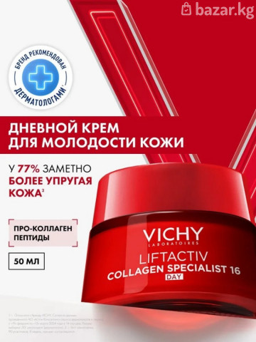 Реновация от Vichy: Liftactiv Collagen 16 высокоэффективный дневной крем для молодости кожи лица с про-коллаген пептидами. Активирует 16 признаков молодости. У 77% женщин кожа заметно более упругая *** Co-Bonding* технология с про-коллаген пептидами стимулирует и укрепляет различные типы коллагена кожи: в 4 раза больше коллагена. Vichy #1 по рекомендации дерматологов в антивозрастном уходе и в сохранении молодости кожи.**** Активирует 16 признаков молодости: крем ремоделирует контур лица, увлажняет и укрепляет кожу, возвращает ей сияние. Морщины и тонкие линии сокращаются. Повышается упругость, эластичность, тонус и плотность кожи. Кожа выглядит наполненной, становится более гладкой и мягкой. Тон и текстура кожи выравниваются. Поры менее заметны. Гипоаллергенно. Протестировано под дерматологическим контролем на чувствительной коже. Активные ингредиенты: инновационная технология Co-Bonding* (Рамноза – Матриксил – Экстракт майтаке) с про-коллаген пептидами стимулирует и укрепляет различные типы коллагена кожи: в 4 раза больше коллагена. - Рамноза – увлажняет и разглаживает кожу. - Матриксил – пептидный комплекс, стимулирующий выработку коллагена и уменьшающий видимость морщин. - Экстракт майтаке – натуральный антиоксидант, укрепляющий кожу и поддерживающий её тонус. - Био-пептиды I и II типа – активно стимулируют выработку коллагена в коже. - Эперулин – вещество, выделенное из амазонского растения семейства бобовых. Обладает противовоспалительным, успокаивающим действием, снижает гиперчувствительность кожи, регулирует воспаления. - Витамин C оказывает противовоспалительное действие на кожу, способствует выработке коллагена IV. Легкая нежирная нелипкая текстура. Способ применения: наносите крем 2 раза в день на очищенную кожу лица. Продукт относится к категориям: anti-age, французская аптечная косметика для женщин и мужчин, антивозрастной крем для лица. Подходит для всех типов кожи: чувствительной, нормальной, жирной, сухой и комбинированной. Используется в качестве антивозрастной уходовой косметики. И для сохранения молодости начиная с 25 лет. Vichy Liftactiv Collagen 16 Specialist – Виши Лифтактив Коллаген Специалист 16. *Среди продуктов VICHY. Тест in vitro. * Тест самооценки 90 участников, 8 недель ****Согласно данным проведенного АО «Астон Консалтинг» опроса дерматологов в период с 28 февраля по 25 марта 2025 года в 14 городах России. Размер выборки: 300 респондентов (дерматологи).