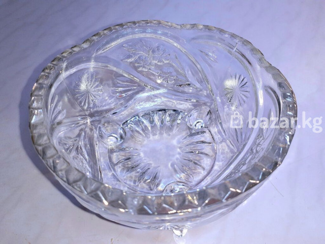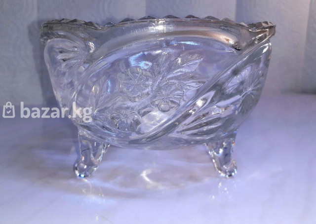 Винтажные вазочки для конфет или варенья, 1980г. СССР. Алмазная резьба. Чешский хрусталь. Ваза на трёх ножках. Высота: 7,3 см. Диаметр: 11,5 см. Толщина: 0,6 см. Состояние: идеальное, ни сколов, ни трещин, ни царапин. 150 сом 2 вазы одинаковые идут комплектом в паре. Высота: 7 см. Диаметр: 13,8 см. Толщина: 0,6 см. Состояние: отличное, в целом ни сколов, ни трещин, ни царапин. 300 сом за 2 шт. За все 3 вазочки - 350 сом.