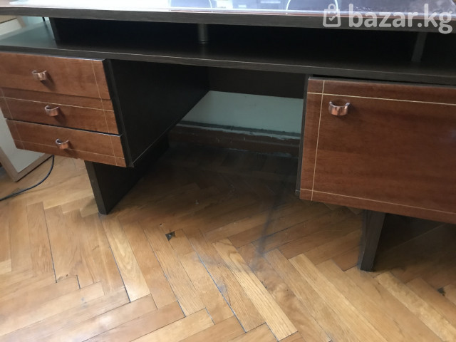 Высокая модульная книжная стенка - Секция из 4 отдельных шкафов, образующих единую стенку. - Каждый модуль оснащен прозрачными дверцами из стекла с ручками-рейлингами по всей ширине. - Каркас в тёмном древесном оттенке, внутренняя спинка – светлее, создаёт контраст и хорошую видимость содержимого. - Многоуровневые полки по всей высоте, подходят для книг, папок формата A4, коллекций и декора. - Полки сплошные, с равномерным шагом; возможна перестановка по высоте (видны ряды креплений). - Оптимально для домашней библиотеки, кабинета или гостиной: пыль защищают стеклянные фасады, при этом всё на виду. - Композицию можно использовать как единую витрину или расставить модули отдельно вдоль стены. Приблизительные характеристики: - Количество модулей: 4 - Тип фасадов: стеклянные - Материал корпуса: ЛДСП/МДФ с древесной текстурой (тёмный тон) - Назначение: книги, документы, коллекции, посуда/декор Лаконичный дизайн, ровные линии, хорошо сочетается с классическим и современным интерьером. К книжной стенке гармонично подойдет Винтажный письменный стол с большим рабочим пространством и классическим дизайном производства ГДР (отдельная цена) Особенности: - Просторная столешница прямоугольной формы. - Левая тумба с тремя выдвижными ящиками. - Правая тумба с распашной дверцей и внутренним отделением для хранения. - Центральная ниша/полка под столешницей для документов или периферии. - Декоративные деревянные ручки, фасады в тёплом коричневом тоне с тонкими инкрустационными линиями. - Устойчивая конструкция на массивных опорах. Подойдёт для кабинета, домашнего офиса или учебного места: удобно хранить канцелярские принадлежности, документы и мелкую технику, сохраняя порядок на рабочей поверхности.