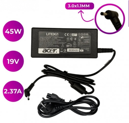 Блок питания для ноутбуков Acer - Совместимый адаптер питания LiteON для Acer - Мощность: 45W - Выходное напряжение: 19V - Ток: 2.37A - Разъём штекера: 3.0 × 1.1 мм (угловой) - Вход: 100–240V, 50–60Hz (сетевой кабель в комплекте) - Метки безопасности и соответствия: CE и др. на корпусе - Цвет: чёрный - Комплектация: сетевой адаптер + кабель питания Подходит для ноутбуков Acer с разъёмом 3.0×1.1 мм и требованиями 19V/2.37A (или выше по мощности). Лёгкий и компактный, штатная длина кабелей для удобства подключения.
