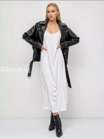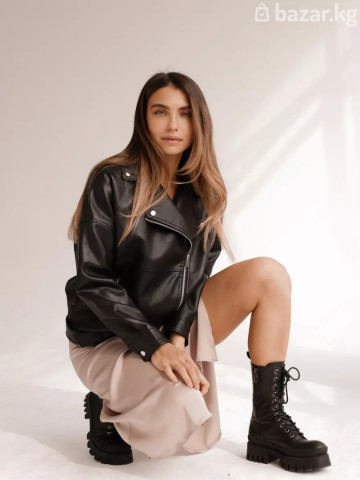 Женская куртка‑косуха, цвет: чёрный. Размер: 44.46.48.50 - Материал: экокожа с лёгким сатиновым блеском. - Классический косой металлический молниевый замок. - Отложной воротник с кнопками. - Пояс по низу с пряжкой и люверсами для регулировки посадки. - Два боковых кармана на молнии + небольшой карман с клапаном и кнопкой. - Прямой свободный крой со слегка заниженной линией плеча. - Фурнитура металлическая, серебристого цвета. - Универсальный стиль: к джинсам, платьям, базовым топам и водолазкам, подходит для межсезонья. Акцентная, удобная и практичная косуха в базовом черном цвете. Оптом ещё дешевле