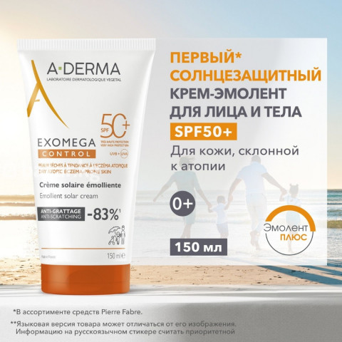 Смягчающий солнцезащитный крем-эмолент для лица и тела A-Derma Exomega Control SPF50+ обеспечивает очень высокую степень защиты от солнца и способствует снижению сухости и раздражения, вызванного сухостью кожи, на 83%. Рекомендован для ухода за сухой и очень сухой кожей, склонной к атопии. Подходит для детей с 6 месяцев и взрослых. Разработан с целью минимизации воздействия на морскую экосистему.