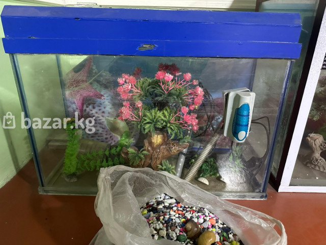 Аквариумный комплект с декоративными элементами - Стеклянный аквариум прямоугольной формы с крышкой синего цвета и двумя откидными люками сверху. - Встроенные вырезы в крышке для кабелей/кормления. - Внутренний фильтр (помпа) с креплением на стенку. - Нагреватель/термонагревательный элемент (виден шнур и колба). - Декор внутри: искусственные растения, коряга/декоративная фигура, фон с морскими мотивами. - Пакет разноцветного грунта-галечника, в том числе крупные элементы/ракушки. АКВАРИУМ НА 40-50ЛИТРОВ Подходит для пресноводного запуска с декоративными рыбками и креветками. Удобная крышка уменьшает испарение и помогает установить светильник (окно под свет сверху). Фильтр обеспечивает механическую и биологическую очистку, нагреватель поддерживает стабильную температуру. Грунт из набора можно использовать как основной субстрат для посадки неприхотливых растений и оформления дна. В комплекте на фото: аквариум с крышкой, внутренний фильтр, нагреватель, искусственные растения и декорации, пакет разноцветного грунта и ракушек. ВСЕ В КОСПЛЕКТЕ