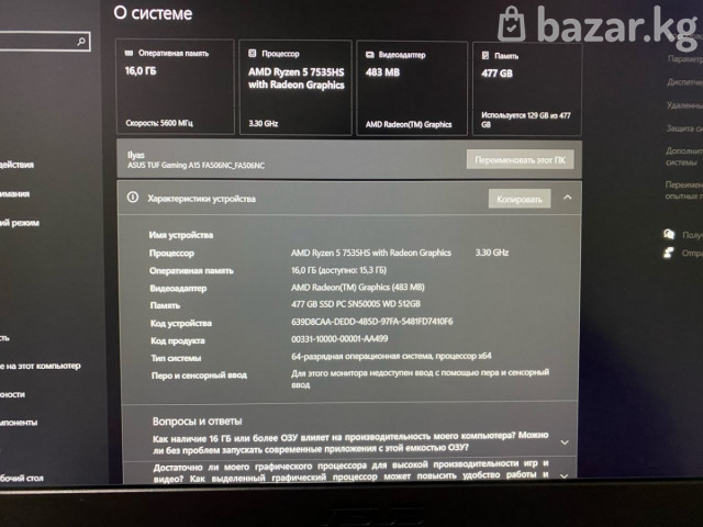 Процессор AMD Ryzen™ 5 7535HS 3,3 ГГц 6 ядер, 12 потоков) Графический процессор NVIDIA® GeForce RTX™ 3050 для ноутбуков, до 1675 МГц при 60 Вт (75 Вт с Dynamic Boost), 4 ГБ GDDR6, Отображать 15,6-дюймовый, FHD (1920 x 1080) 16:9, бюджетный IPS-дисплей с антибликовым покрытием,Частота обновления: 144 Гц, Adaptive-Sync, Optimus Память Твердотельный накопитель PCIe® 4.0 NVMe™ M.2 емкостью 512 ГБ Слоты расширения (включая используемые) 2 слота DDR5 SO-DIMM 2 слота M.2 PCIe