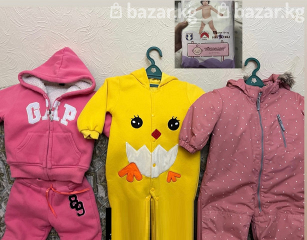 Б/У Набор детской одежды на возраст 1–1,5 года (осень/весна): - Тёплый розовый спортивный костюм GAP: худи на молнии с капюшоном и мягкой подкладкой из «овчинки», карманы-кенгуру; брюки на резинке с шнурком, нашивка 89 - Жёлтый флисовый комбинезон с капюшоном и молнией по центру, декор «цыплёнок» спереди. - Розовый утеплённый комбинезон с короткими рукавами, капюшоном с меховой отделкой, молнией спереди и боковым карманом на молнии; принт мелкий горошек. За все три — 1500 сом. В подарок — упаковка новых подгузников.
