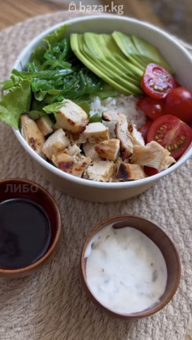 Запечённая курочка (готовим сами - в печи), спелый авокадо, чука, черри, OryPLb, рис, айсберг Соус на выбор: терияки или Поке соус